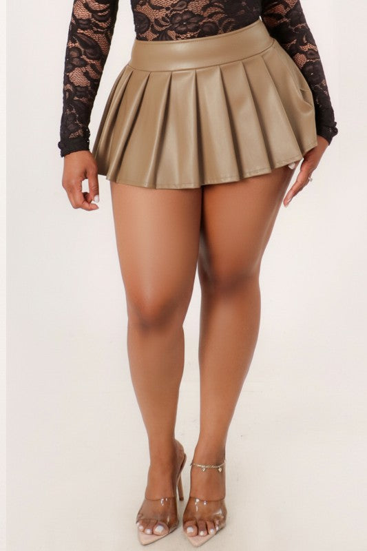 The It Girl pleated Skort-Taupe WEARS SIZE SMALL. MODEL HEIGHT IS 5' 5". STRETCHY FAUX LEATHER PLEATED MINI SKIRT SKORT.